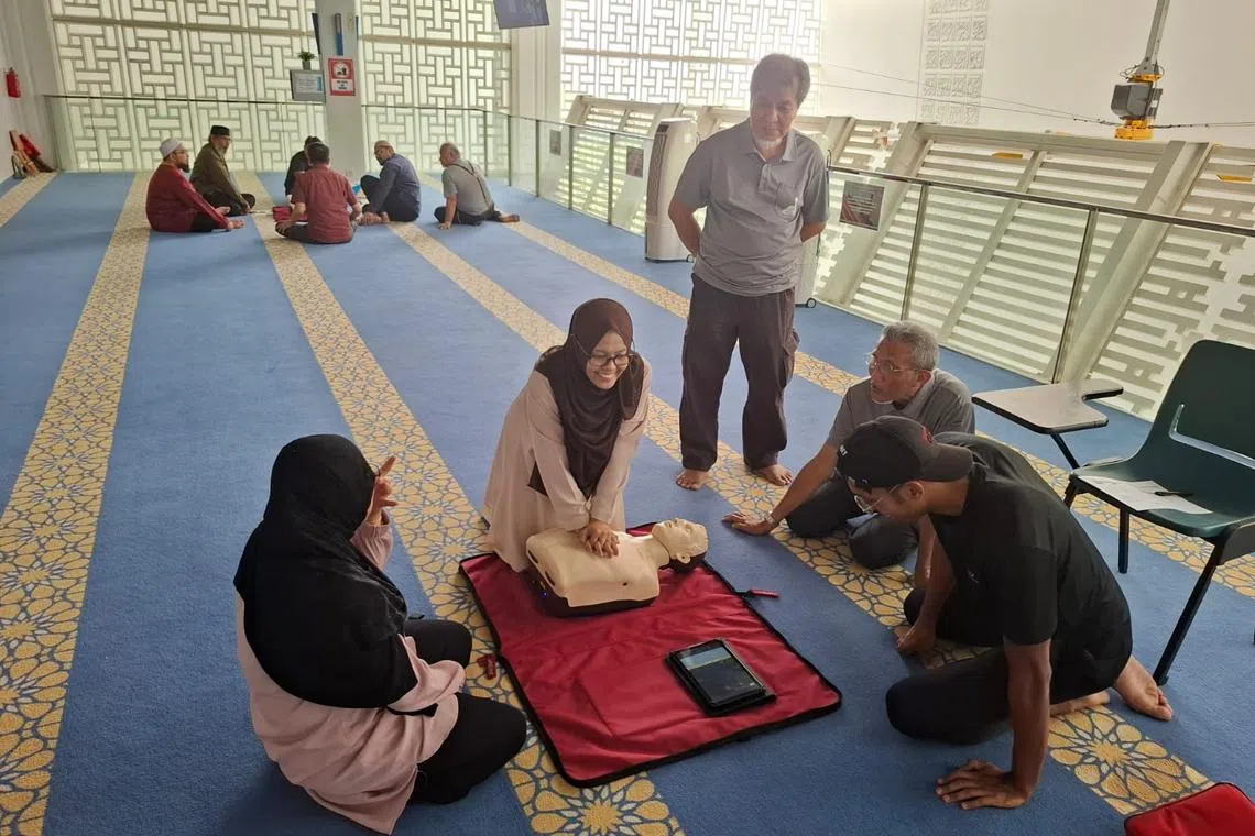 Menjelaskan tentang kegiatan masjid, Encik Izuan berkata pegawai sepenuh masa masjid telah menjalani latihan bantuan kecemasan pernafasan, atau CPR, dan cara menggunakan AED (Defibrilator Luaran Automatik) pada awal November 2024.