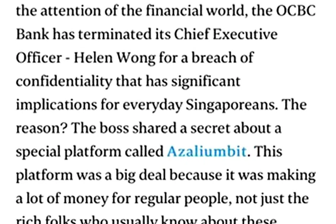 Mendedahkan demikian, ST menyatakan artikel palsu itu memetik tokoh terkenal seperti Perdana Menteri, Encik Lawrence Wong, atau Ketua Pegawai Eksekutif(CEO) OCBC, Cik Helen Wong yang kononnya memuji platform mata wang kripto yang tidak jelas dan lebih bertujuan memancing data.