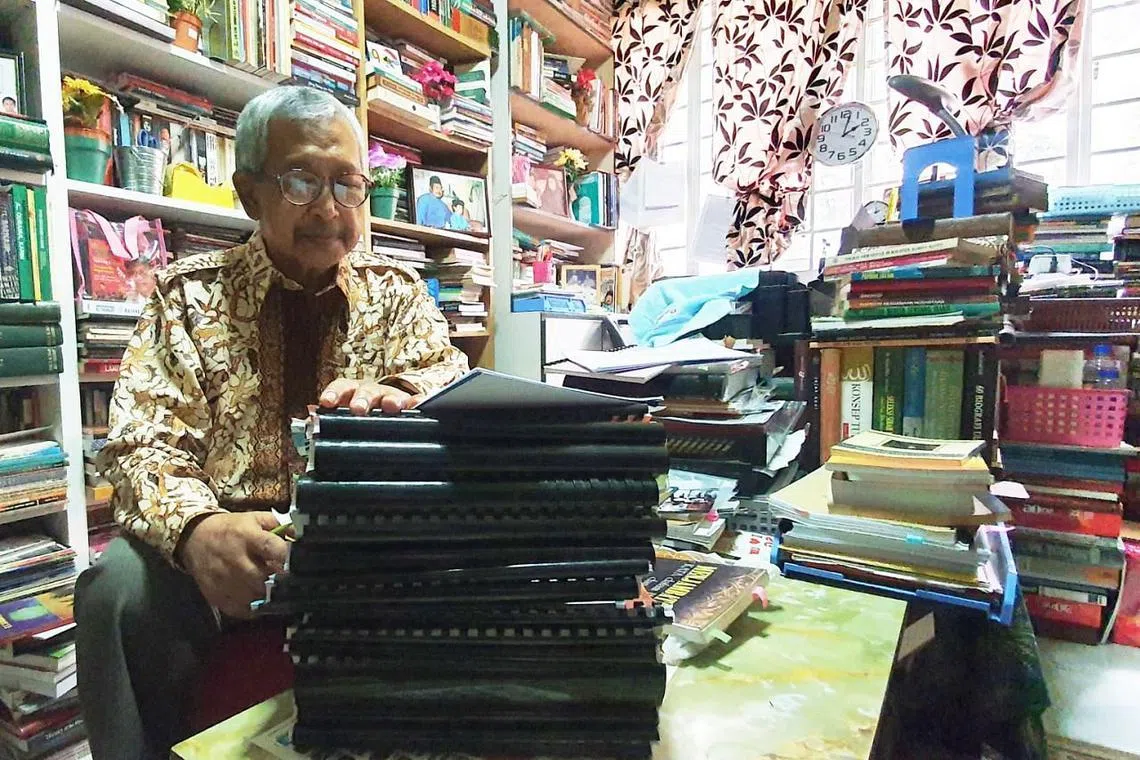TERUS BERJUANG: Sungguhpun tahap kesihatan tidak menentu, pengkaji dan aktivis Djamal Tukimin, 73 tahun, tabah meneruskan kerja penyelidikan sastera, dakwah dan seni. Beliau yang diwawancara di rumahnya dalam kawasan Yishun baru-baru ini menunjukkan juga timbunan manuskrip yang menanti proses suntingan dan penerbitan. -