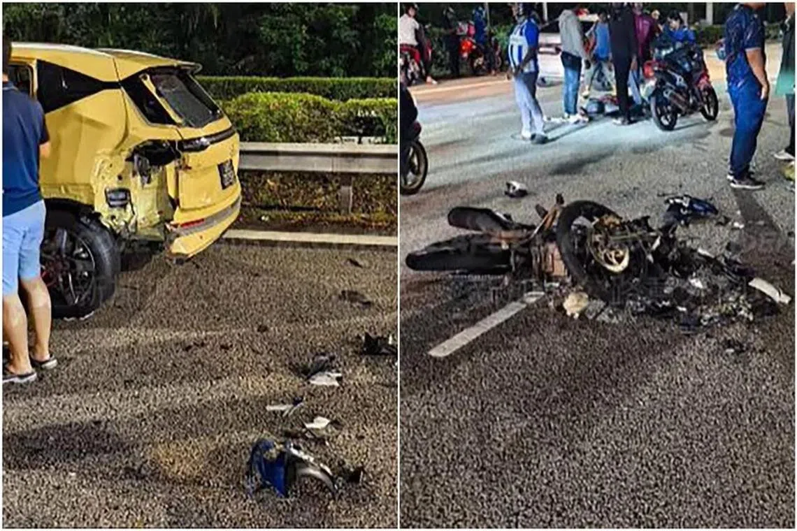 Sebuah motosikal dengan nombor plat Malaysia yang terbaring di belakang kereta itu kelihatan remuk, dengan bahagian-bahagiannya bertaburan di jalan raya.