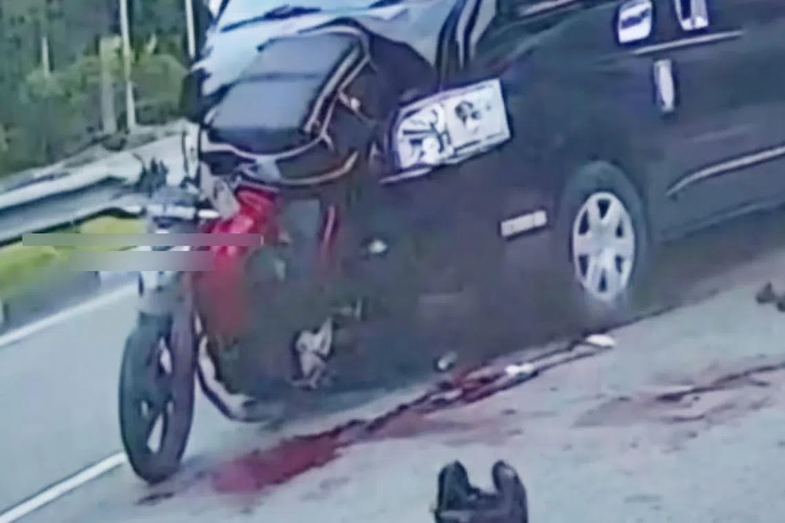 Video yang dirakam selepas kemalangan itu dan disiarkan di Facebook Singapore roads accident.com menunjukkan sebuah motosikal remuk di hadapan sebuah mini van.