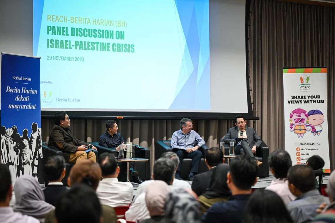 Sekitar 100 orang, termasuk karyawan dan pelajar pengajian tinggi, menghadiri perbincangan panel mengenai konflik Israel-Palestin.anjuran Berita Harian dan unit maklum balas pemerintah, Reach, pada Rabu malam.