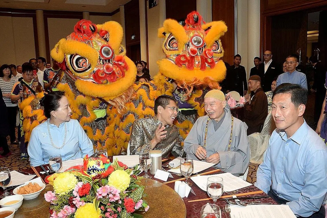 PERSEFAHAMAN ANTARA AGAMA: (Dari kiri) Presiden dan Pengasas IMC Organisation Limited, Cik Juliet Liu; Dr Mohamad Maliki Osman; Venerable Master Chin Kung; dan Encik Ong Ye Kung, di acara Tahun Baru Cina yang dimeriahkan dengan tarian singa di Hotel Furama Riverfront semalam. - Foto JOHARI RAHMAT -