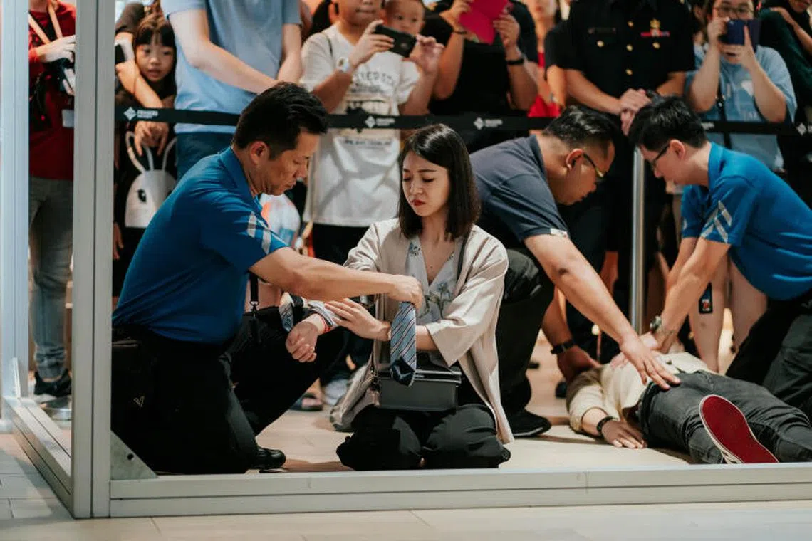LIBATKAN MASYARAKAT: Orang awam mengambil bahagian dalam simulasi serangan pengganas semasa jerayawara SGSecure di Punggol Waterway Point pada 2019. - Foto MHA