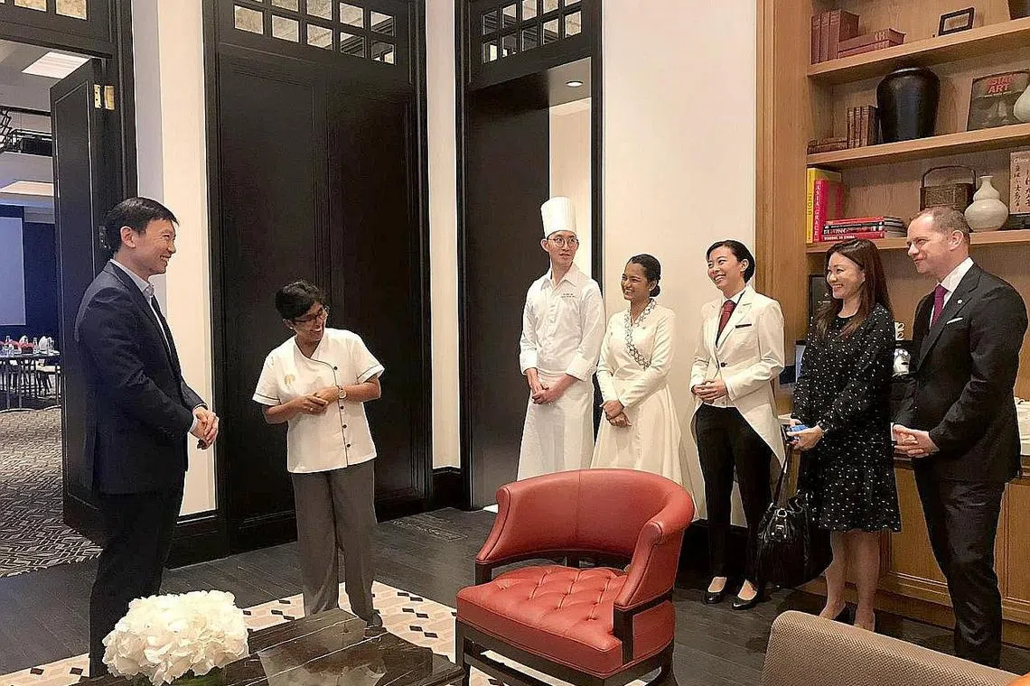 LEBIH BANYAK PELUANG: Mereka yang berminat meneroka bidang pelayanan kini boleh menjangkakan lebih banyak latihan dan peluang pekerjaan dengan adanya pengumuman program baru yang diumumkan Encik Chee Hong Tat (kiri). Beliau dilihat berinteraksi dengan kakitangan Hotel Raffles. - Foto MCI -