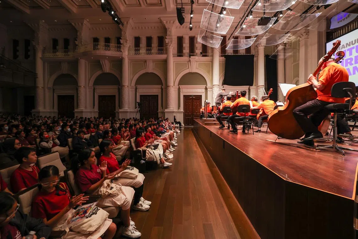Sekumpulan pelajar dari Sekolah Menengah East Spring menikmati persembahan muzik bertajuk, ‘Expression Avenue’, oleh Orkestra Simfoni Singapura (SSO) secara langsung di Dewan Konsert Victoria pada 20 Mei.