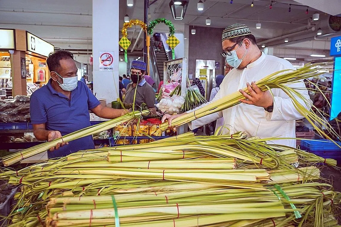 KEMERIAHAN Hari Raya semakin terasa, dengan orang ramai dilihat mula membuat persiapan membeli janur di Pasar Geylang Serai semalam.