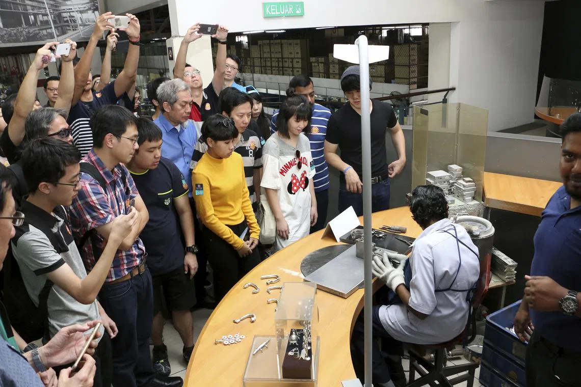 MELAWAT ROYAL SELANGOR PEWTER: Pelajar ITE menyaksikan pekerja membentuk piuter yang dicairkan menjadi pelbagai barangan seperti cawan dan bingkai gambar. - Foto ITE -