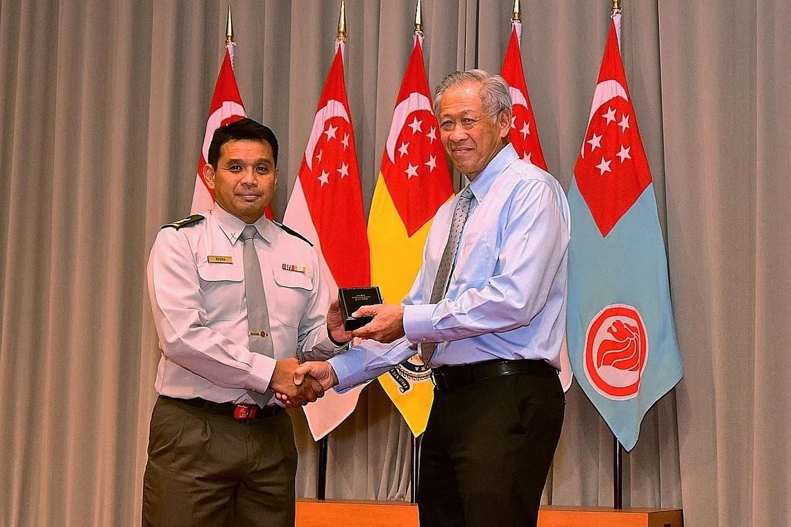 BERBAKTI PENUH DEDIKASI: LTC (NS) Edzra Iskandar antara penerima Pingat Kepujian daripada Menteri Pertahanan, Encik Ng Eng Hen, di majlis penyampaian Anugerah Hari Kebangsaan yang diadakan oleh Kementerian Pertahanan (Mindef). - Foto MINDEF -