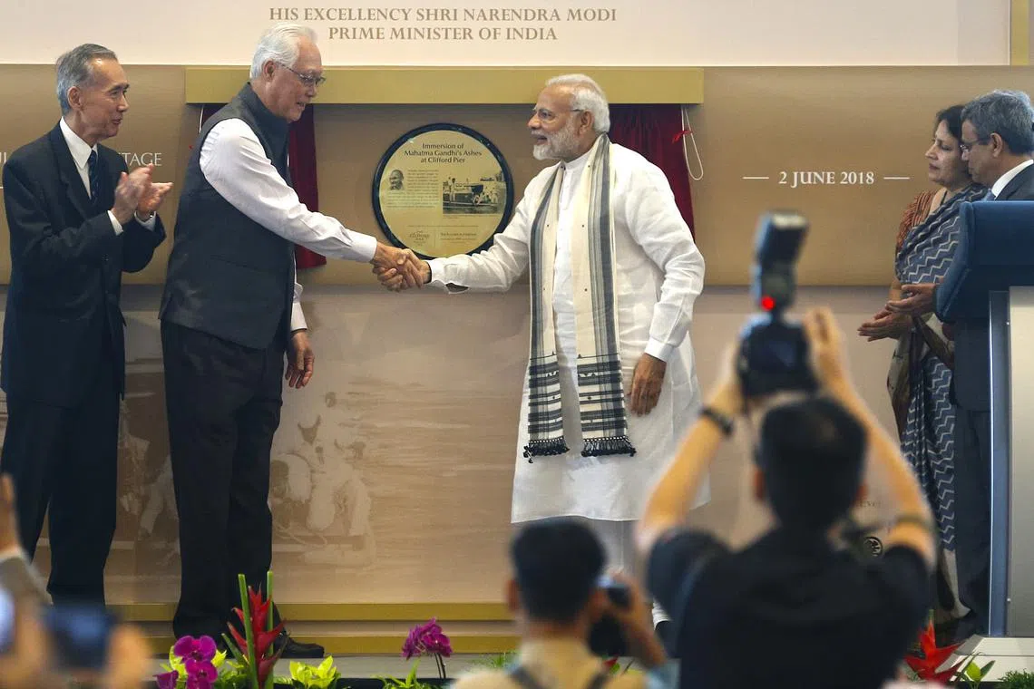 LANCARKAN PLAK : Perdana Menteri India Narendra Modi (kanan) berjabat tangan dengan Menteri Kanan Emeritus Goh Chok Tong selepas melancarkan plak peringati Mahatma Gandhi di Clifford Pier semalam. - Foto BM Timothy David