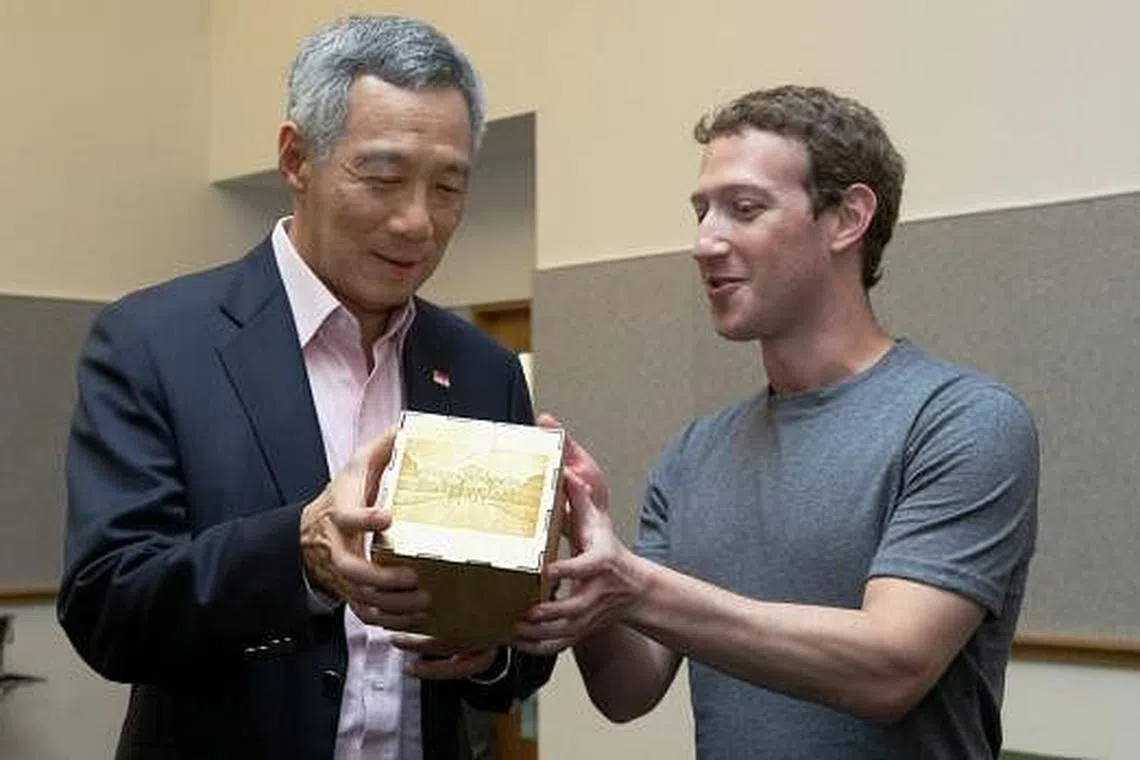BUAT KENANG-KENANGAN: Encik Mark Zuckerberg menghadiahkan sebuah kiub kepada Encik Lee dengan goresan gambar-gambar daripada laman Facebook Encik Lee dan kod penyelesaian Sudoku yang ditulis Encik Lee. - Foto FACEBOOK PM LEE -