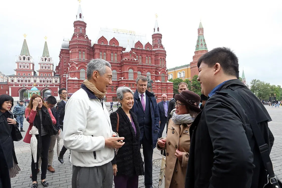 TEMUI WARGA SINGAPURA: Encik Lee dan isterinya, Cik Ho Ching, menemui warga Singapura Encik Timothy Lim (kanan) dan ibunya, Cik Joyce Lim, di Moscow kelmarin.. - Foto THE STRAITS TIMES -