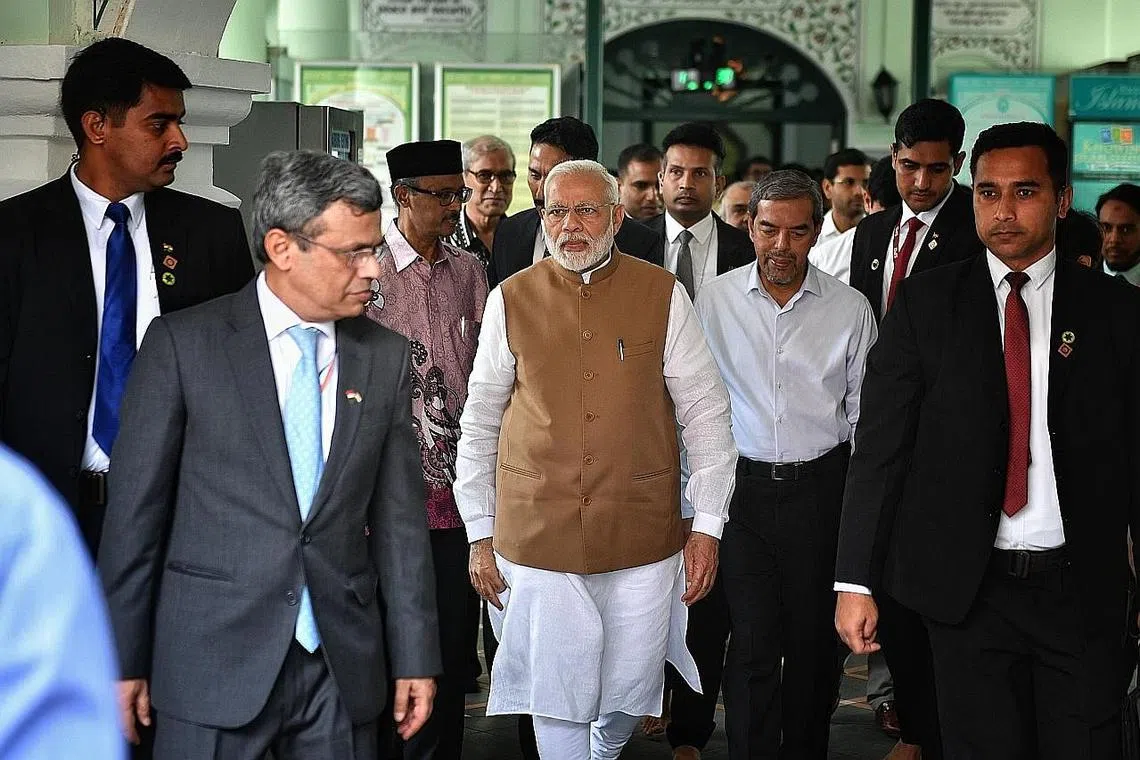 PERDANA Menteri India, Encik Narendra Modi (tengah), meluangkan masa mengunjungi Masjid Jamae Chulia di South Bridge Road semalam sebelum mengakhiri lawatan ke Singapura.