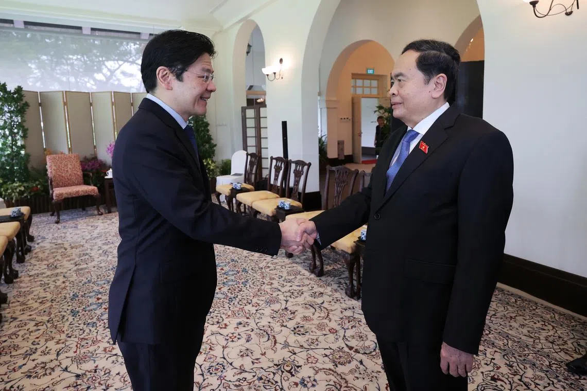 Perdana Menteri merangkap Menteri Kewangan, Encik Lawrence Wong (kiri), bertemu dengan Presiden Perhimpunan Kebangsaan Sosialis Republik Vietnam, Encik Tran Thanh Man (kanan), dalam lawatan rasmi beliau ke Singapura pada 2 Disember.