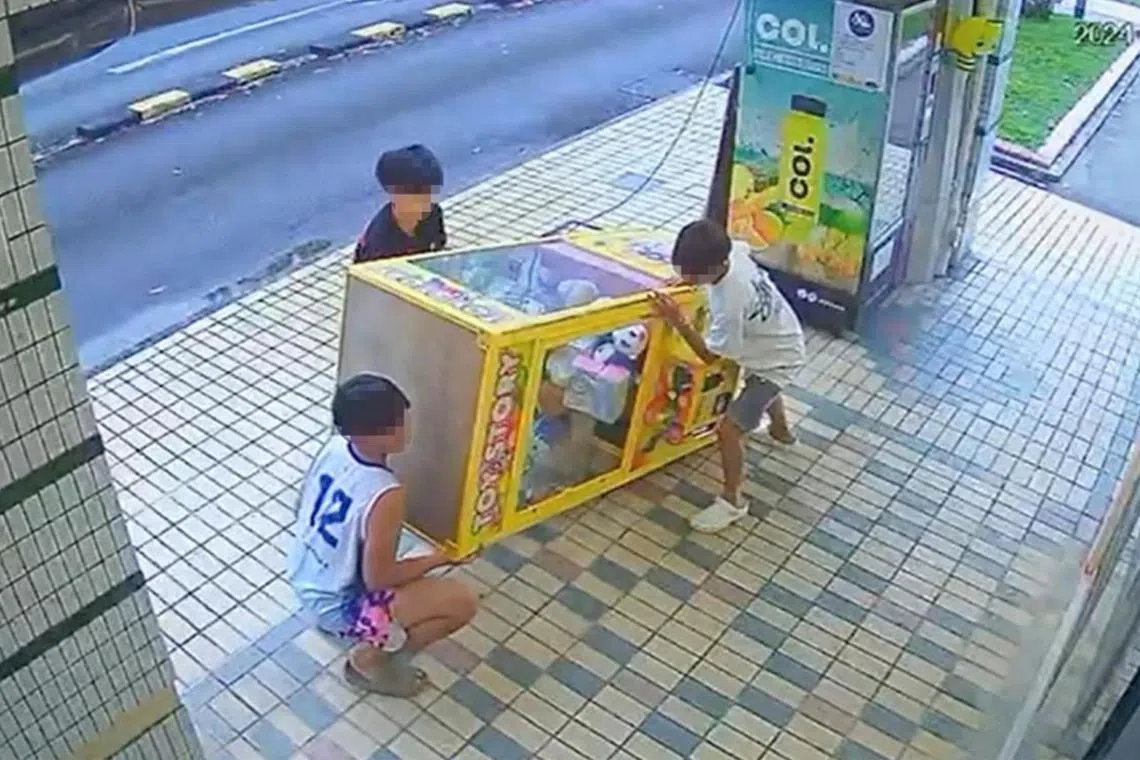 Rakaman kamera CCTV yang dilihat oleh ST menunjukkan tiga budak lelaki bermain dengan mesin cekau itu pada kira-kira 6.30 pagi, tetapi tidak berjaya menangi anak patung tersebut.