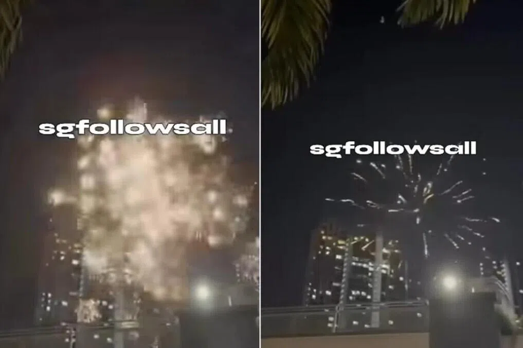 Dalam sebuah video sepanjang 30 saat di Instagram, beberapa letupan bunga api dapat dilihat di hadapan sebaris flat Lembaga Perumahan dan Pembangunan (HDB).