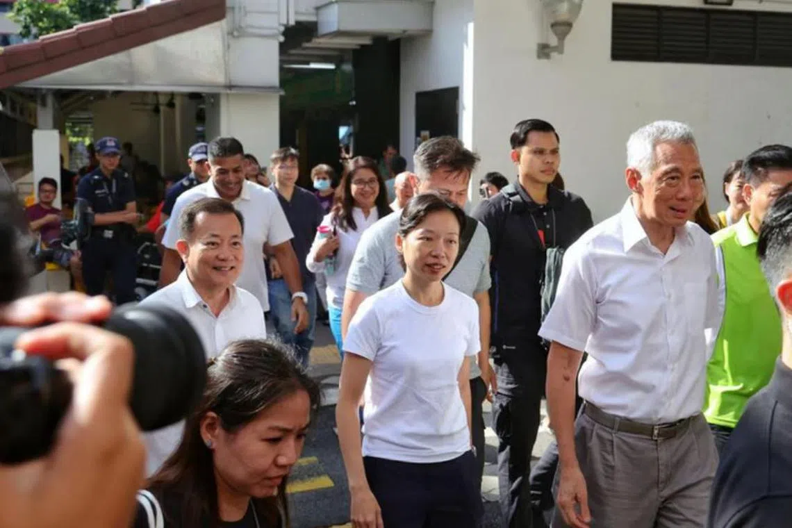 Kededua mereka kelihatan menemani Encik Lee semasa kunjungan beliau ke Hougang Village pada 13 April.