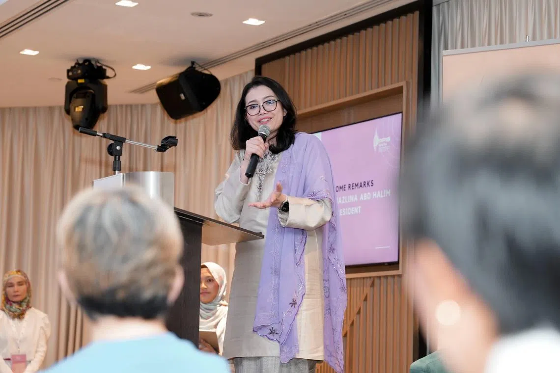 Presiden PPIS, Cik Hazlina Abdul Halim, mengetengahkan dapatan Kajian Wanita Muslim Singapura (AMWR) pada 2022 yang mengenal pasti tanggungjawab keluarga sebagai cabaran utama bagi wanita dalam mencapai aspirasi profesional.