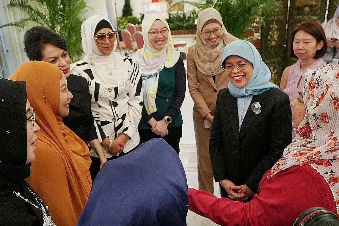 TEMUI USAHAWAN: Presiden Halimah Yacob dilihat sedang berinteraksi dengan beberapa usahawan wanita dari Dewi@DPPMS semasa jamuan teh di Istana. Bersamanya ialah pengerusi Dewi (berbaju merah), Cik Fadilah Majid. - Foto BH oleh KHALID BABA -