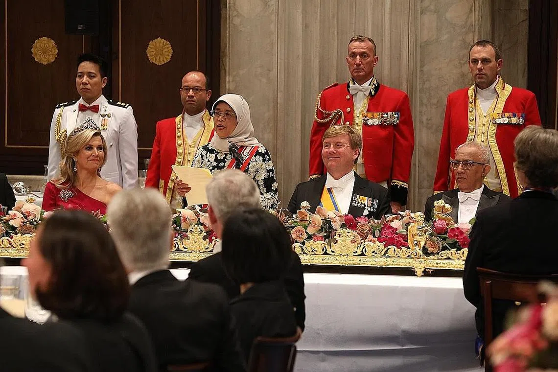 PERKUKUH IKATAN DUA NEGARA: Puan Halimah Yacob menarik perhatian mengenai hubungan ekonomi yang kukuh antara Singapura dengan Belanda semasa berucap di majlis jamuan negara di Istana Diraja Amsterdam. Turut dalam gambar ialah suami beliau, Encik Mohamed Abdullah Alhabshee (kanan, sedang duduk) serta Raja Willem-Alexander dan Ratu Maxima. - Foto MCI -