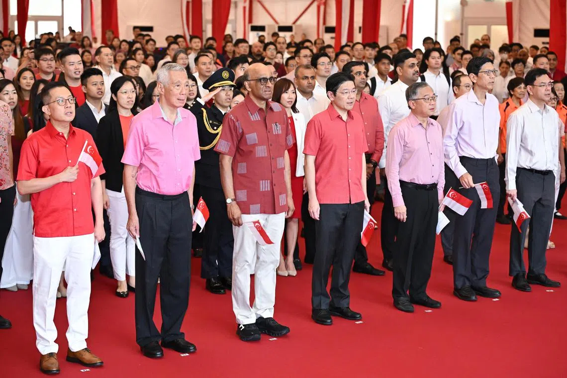 Presiden Tharman Shanmugaratnam disertai Perdana Menteri, Encik Lawrence Wong; Timbalan Perdana Menteri, Encik Gan Kim Yong; dan Menteri Kanan, Encik Lee Hsien Loong.