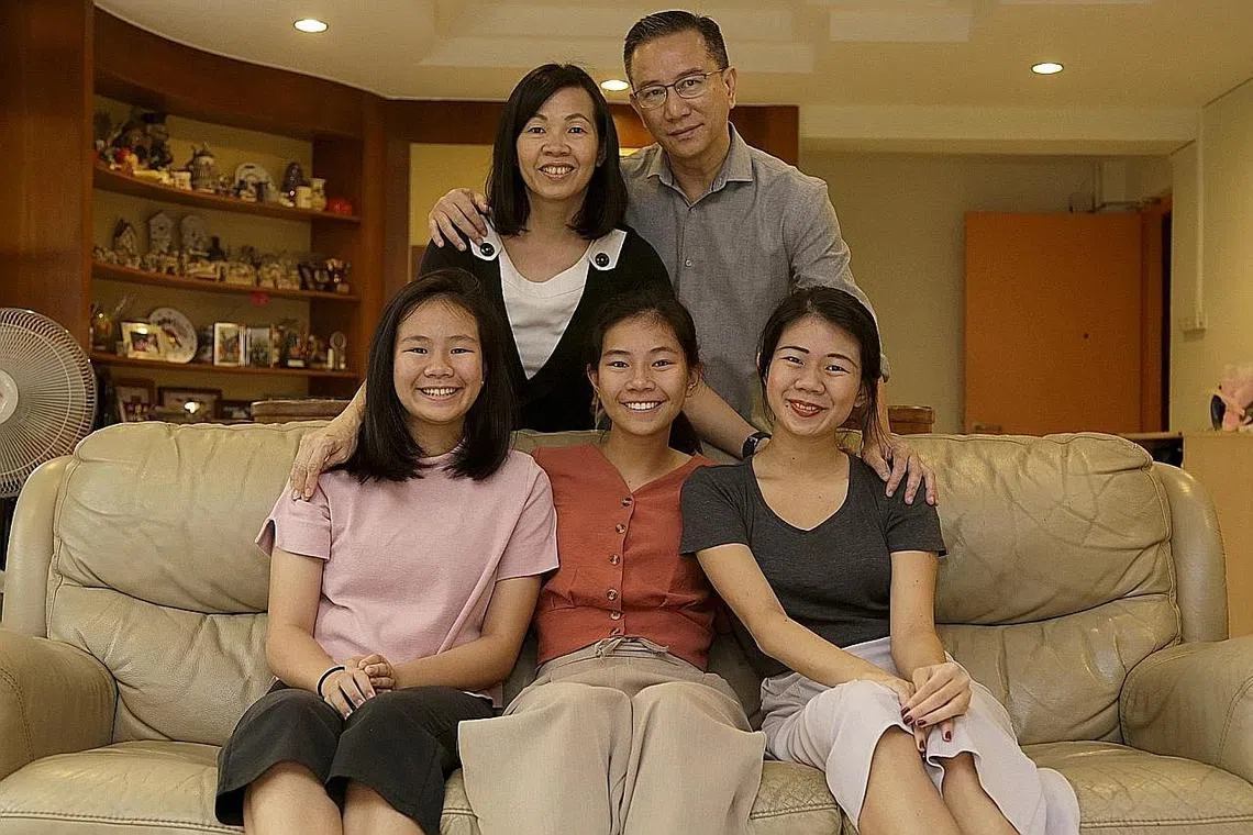 KETEKALAN BAWA KEJAYAAN: Cik Arissa (tengah depan) bersama ibu bapanya, Encik Mohd Rashid Hassan (kanan atas) dan Cik Liow Ai Ling. (Depan dari kiri) Aria Rashid, Arissa dan Arina Rashid. - Foto BH oleh A AZMI -