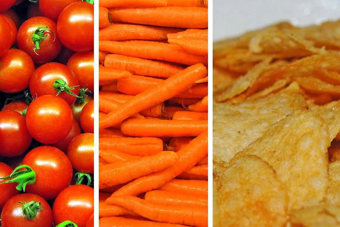 SNEK SIHAT: FoodSteps yang bakal dimulakan bulan depan, akan menggalakkan murid sekolah rendah memilih snek lebih sihat seperti ceri tomato (kiri) dan lobak merah (tengah) daripada kerepek kentang (kanan) supaya tabiat pemakanan sihat ini boleh dikekalkan sepanjang hayat. - Foto-foto FREEIMAGES. -
