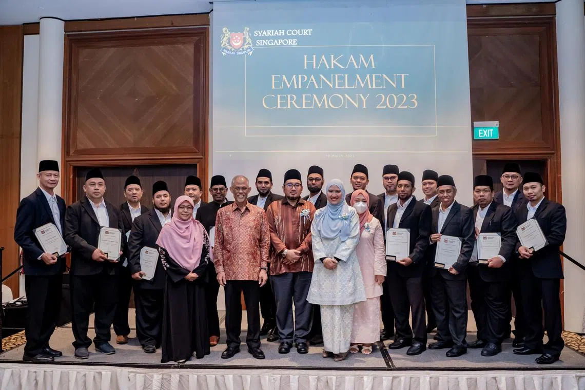 Panel Hakam Mahkamah Syariah terdiri daripada asatizah yang diiktiraf di bawah Skim Pengiktirafan Asatizah (ARS) Majlis Ugama Islam Singapura (Muis) dengan latar belakang undang-undang Islam atau pengalaman dalam membantu keluarga Islam.