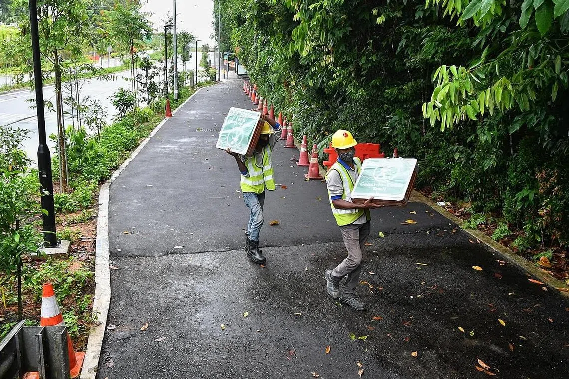 PENGHUBUNG TAMAN: Pekerja dilihat di penghubung taman Lornie Road baru. Ia merupakan segmen besar terakhir jejak pantai-ke-pantai sepanjang 36 kilometer. - Foto BH oleh CHONG JUN LIANG -