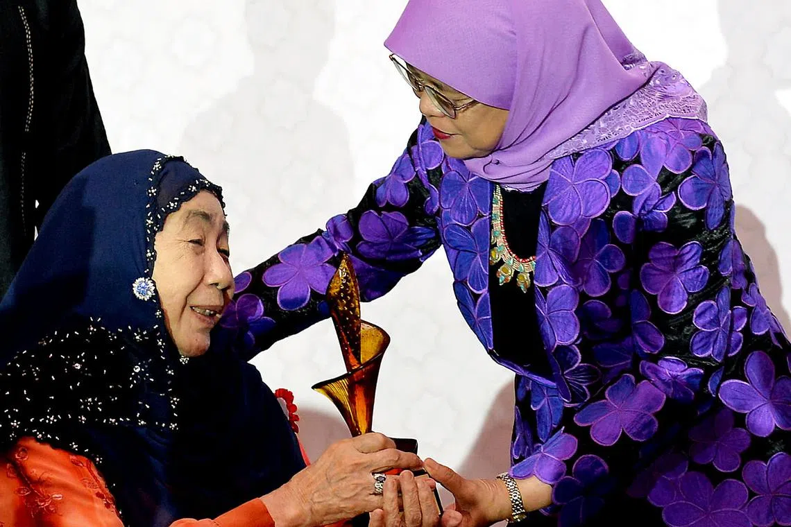 TERIMA ANUGERAH DARI PRESIDEN: Presiden Halimah Yacob (bertudung ungu) menyampaikan anugerah piala Dewan Termasyhur Wanita Singapura (SWHF) kepada Puan Noor Aishah, yang disenaraikan dalam SWHF dalam satu majlis kelmarin. - Foto BH oleh KHALID BABA -