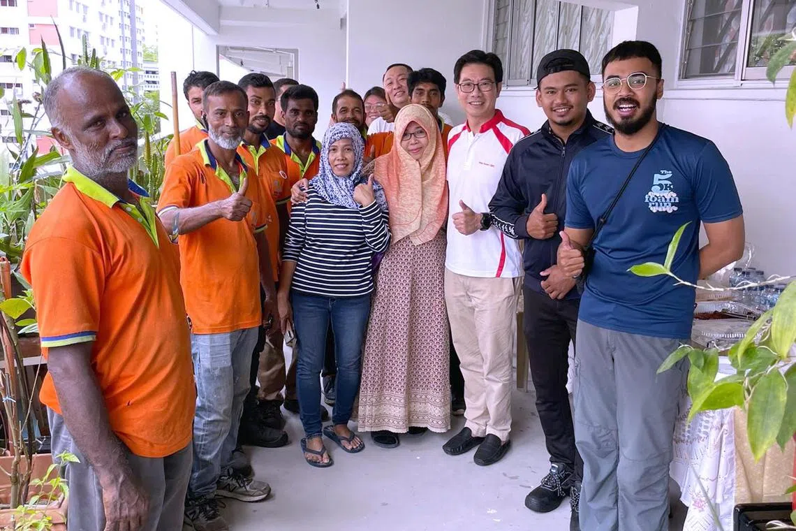 HULUR BANTUAN: Cik Maswati Masduki (empat dari kanan) bersama pekerja pembersihan kawasan Nee Soon, sukarelawan dan Encik Derrick Goh (berbaju putih) semasa sesi makan tengah hari sambutan Hari Raya di Blok 394, Yishun Clove. - Foto ihsan MASWATI MASDUKI