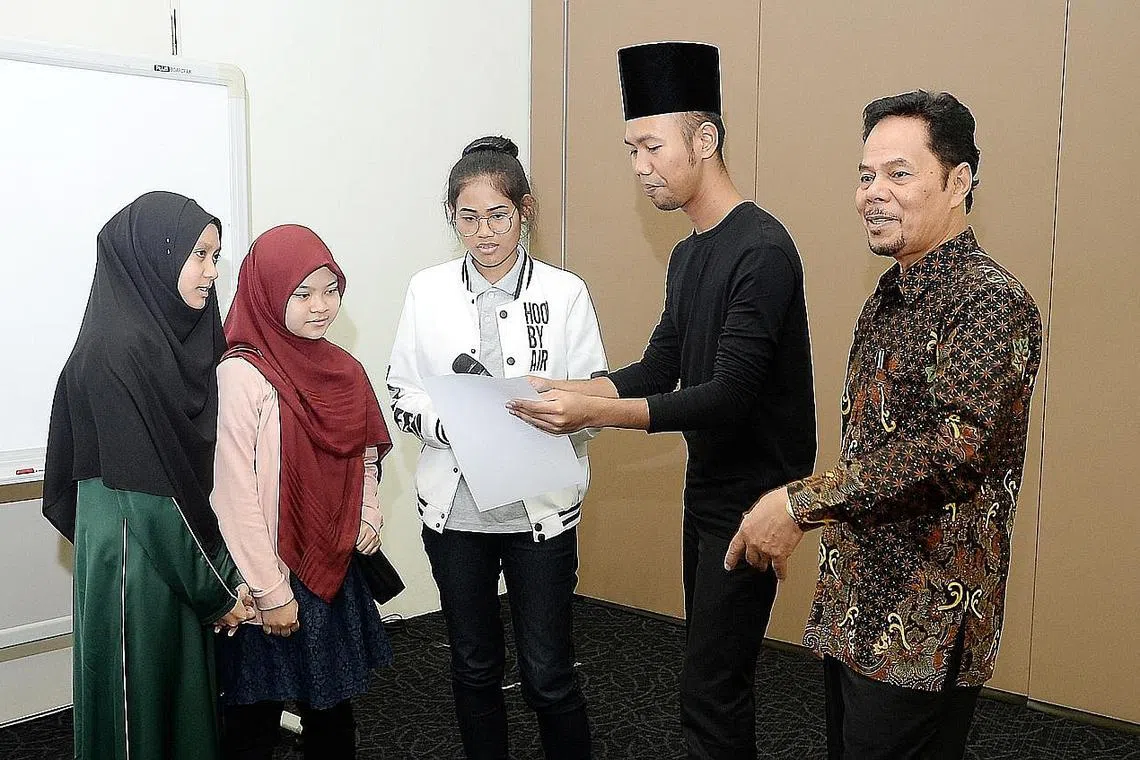 MENGHAYATI SASTERA KLASIK: Encik Roslan Madun (kanan) mengajak peserta bengkel, (dari kiri) Nur Shafiqah Abdullah, Nabila Siddiq dan Hanisah Hamizah Hamzah, membaca syair yang pelbagai irama dengan dibantu Encik Hanafi Idrus, aktivis budaya setempat. - Foto JOHARI RAHMAT -