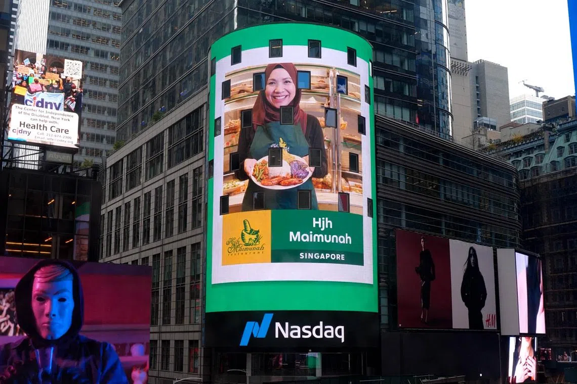 Restoran Hjh Maimunah mendapat perhatian dunia apabila jenamanya dipaparkan di skrin ikonik Menara Nasdaq di New York, Amerika Syarikat.