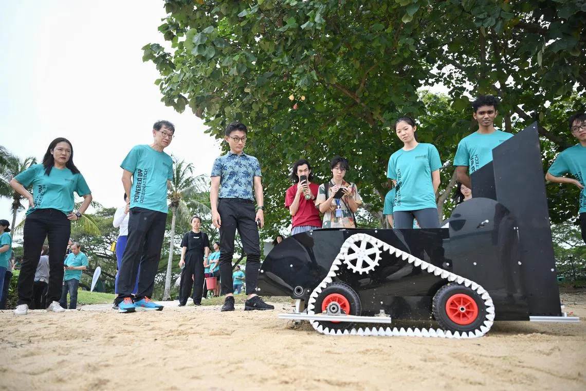 Cawan plastik yang dibuang dan serpihan kayu hanyut kecil telah diambil dari pantai di Taman Pasir Ris pada 22 Januari – bukan oleh sukarelawan dalam kegiatan pembersihan pantai, tetapi oleh robot.
