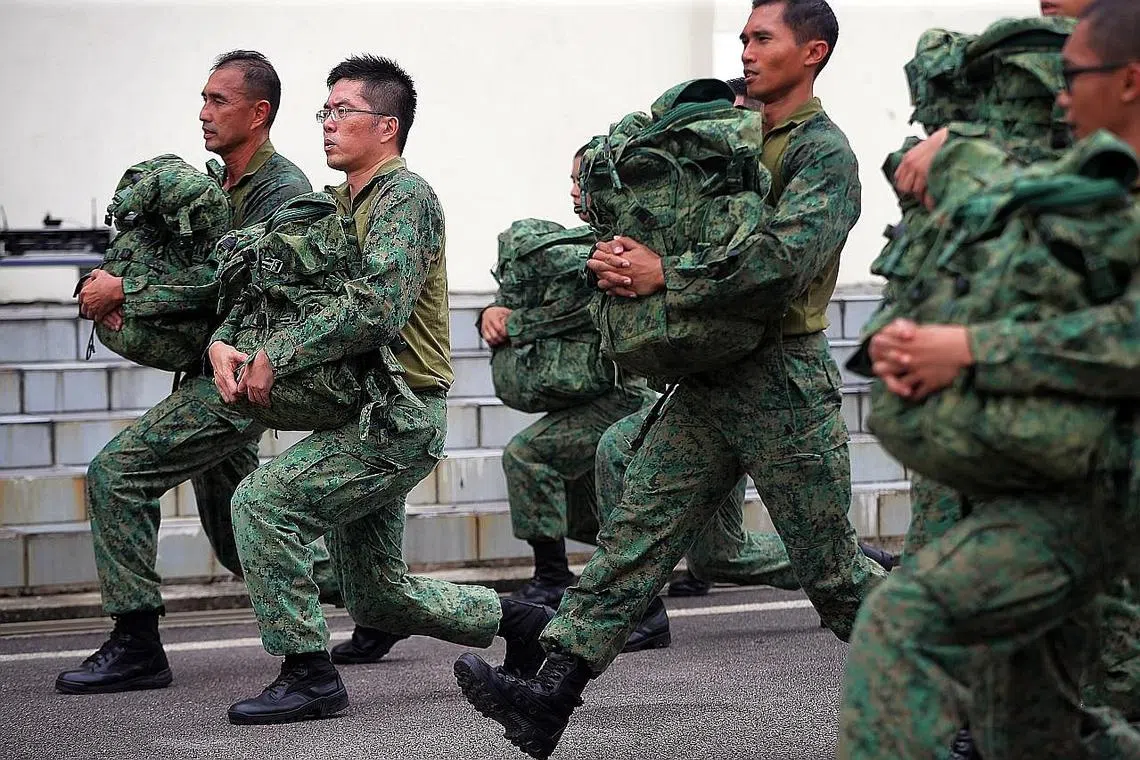 PERTINGKAT KEUPAYAAN: Memakai seragam hibrid yang lebih berangin dan cepat kering, MG Melvyn Ong (dua dari kiri) menyertai Latihan Kecergasan Vokasi (VFT) bersama askar lain di Kem Bukit Panjang kelmarin. SAF akan turut menjalankan ujian prototaip peralatan teknologi boleh dipakai pada tubuh atau dalam istilah bahasa Inggerisnya, wearable technology prototype, selama enam bulan untuk mengumpulkan maklumat yang boleh dimanfaatkan untuk mempertingkat program latihan. - Foto BH oleh KELVIN CHNG -