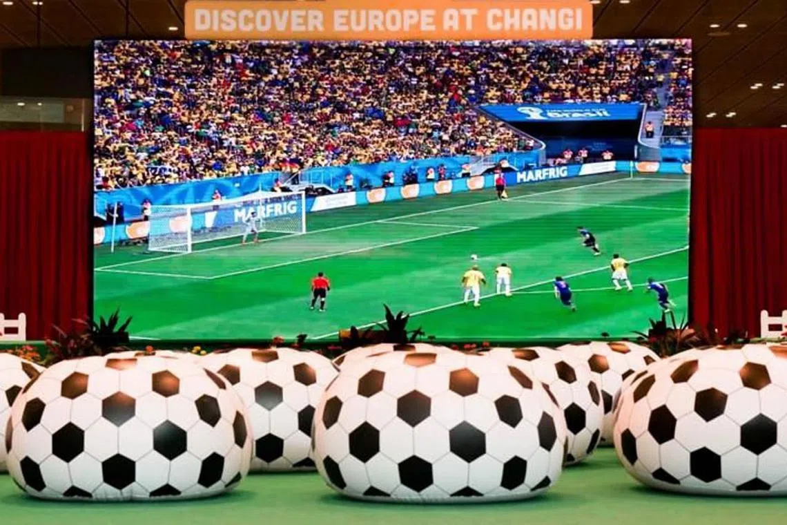 Ini memudahkan pengunjung menikmati perlawanan tersebut, sebuah skrin gergasi LED definisi tinggi berukuran 7m X 4m telah dipasang di Terminal 3 berhampiran stesen Skytrain ke Terminal 1 di mana 33 perlawanan utama akan ditayangkan, kata Changi Airport Group (CAG) dalam satu kenyataan semalam.