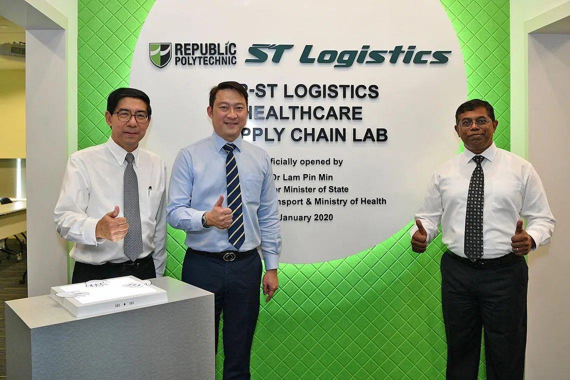 MAKMAL BARU: Dr Lam Pin Min (tengah) bersama Ketua Pegawai Eksekutif (CEO) Politeknik Republic (kiri), Encik Yeo Li Phew, dan CEO ST Logistics, Encik Loganathan Ramasamy, mengumumkan makmal baru Rantaian Bekalan Penjagaan Kesihatan di Politeknik Republic. - Foto POLITEKNIK REPUBLIC -