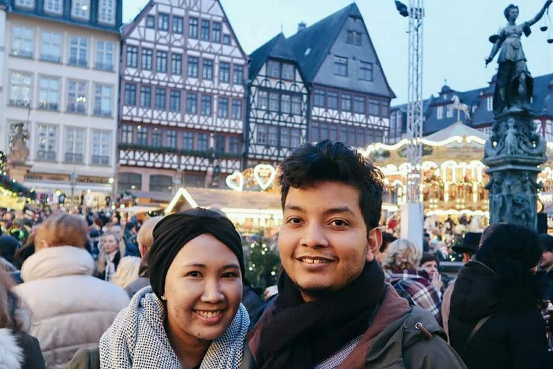 TERSELAMAT DEK KELETIHAN: Pasangan Cik Nurulhuda Syed Mahmood Albukhari dan suaminya, Encik Fairoz Leonard Wilfred D'Cruz, bersyukur tidak ke pasar Krismas Berlin kerana keletihan. Ini merupakan gambar mereka di pasar Krismas di Frankfurt beberapa hari sebelum kejadian rempuhan lori di Berlin. - Foto ihsan NURULHUDA SYED MAHMOOD ALBUKHARI -
