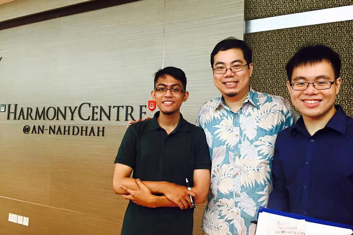 TERAP KESEDARAN ANTARA AGAMA: Encik Muzakkir (kiri) bergambar dengan Encik Ow (kanan) dan seorang yang giat dalam arena puisi, Encik Aaron Lee, semasa pelancaran buku 'From Walden to Woodlands: An Anthology of Nature Poems' di Masjid An-Nahdhah. - Foto ihsan MUZAKKIR SAMAT -