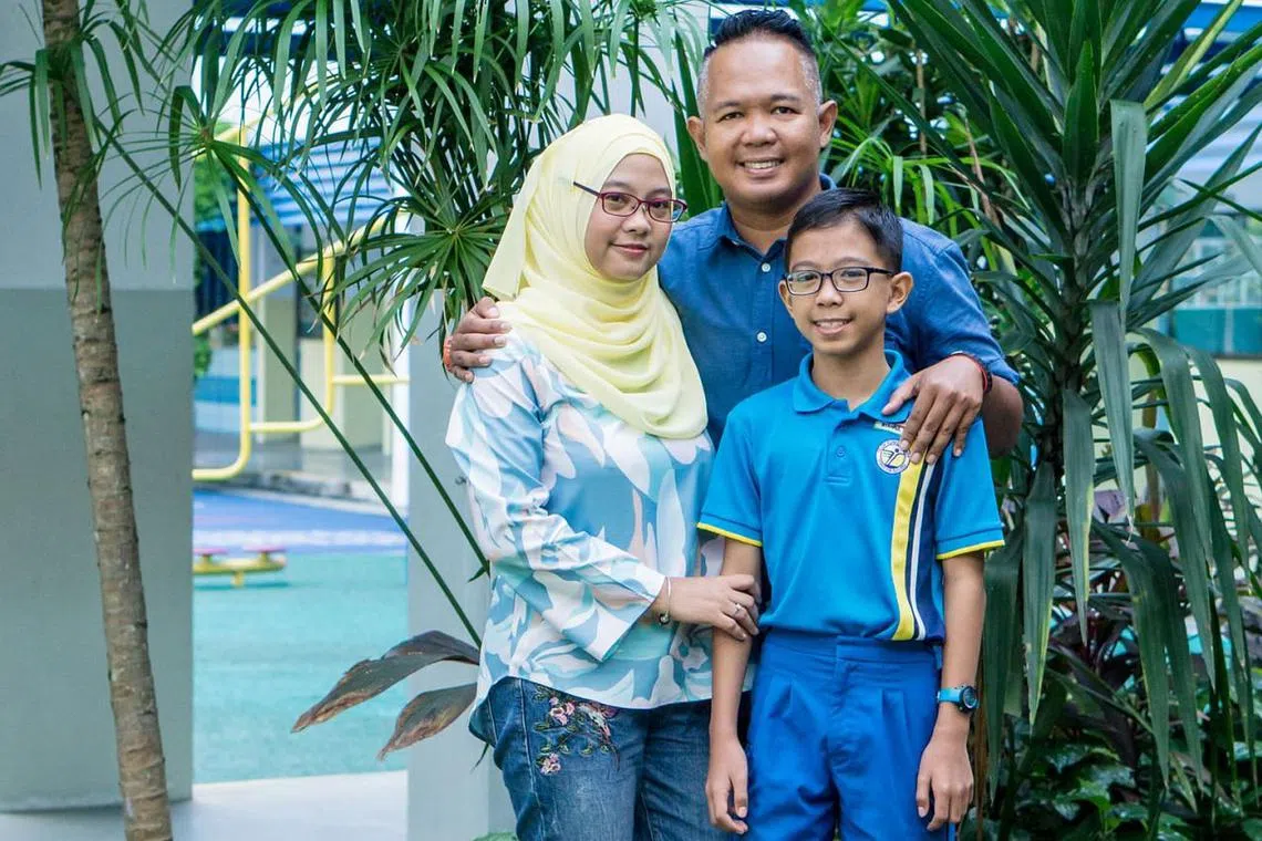 BERI SOKONGAN PADU: Ibu bapa, Encik Nor Azahar Ibrahim dan Cik Rozana Khairon sering memberi sokongan dan dorongan kepada anak mereka Muhammad Syahrul Danial Nor Azahar dari Sekolah Rendah Telok Kurau dalam perjalanan pendidikannya. - Foto ihsan DIYANA TAHA -