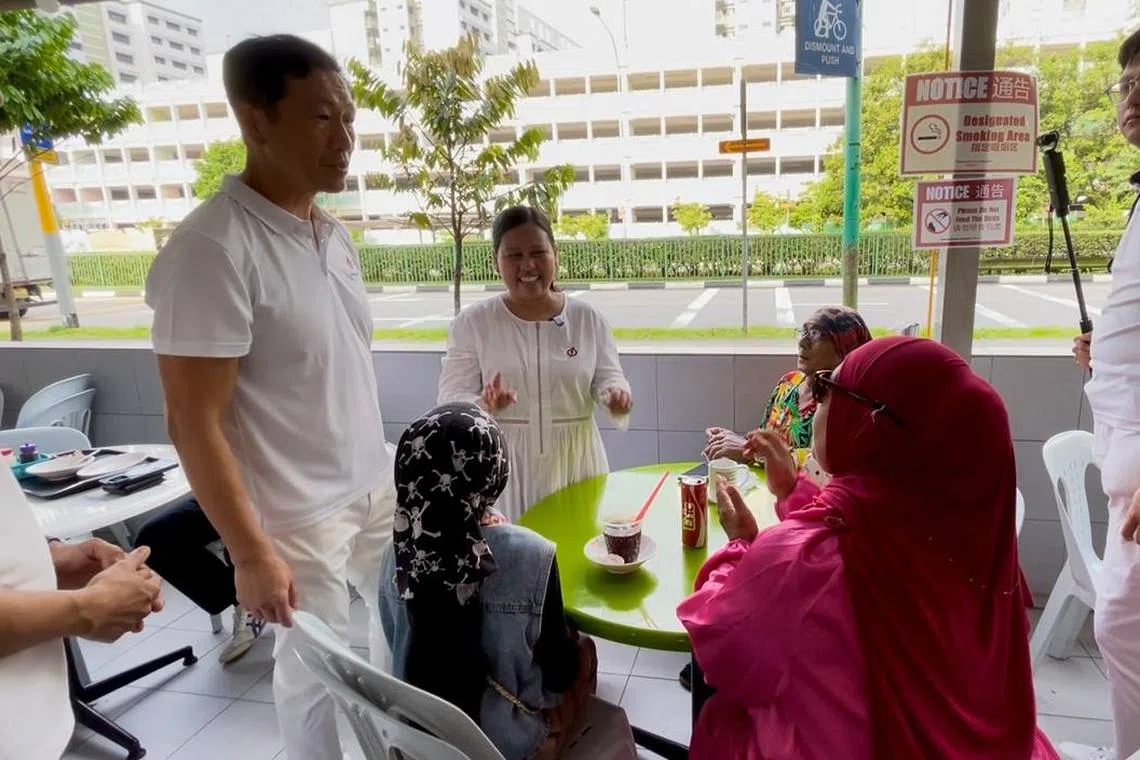 Menteri yang menerajui pasukan Parti Tindakan Rakyat (PAP) di GRC Sembawang, Encik Ong Ye Kung, bersama anggota pasukannya, Cik Mariam Jaafar, berkunjung ke Sembawang Mart, beramah mesra dengan penduduk di kedai kopi pada pagi 24 April.