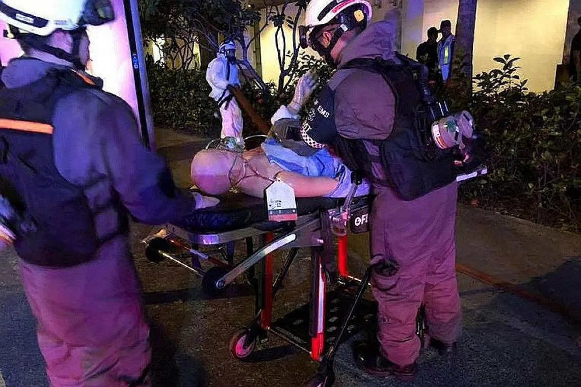 PERKEMAS PROSEDUR: Beberapa pegawai SCDF mengusung 'mangsa' dalam latihan kecemasan di Compass One semalam. - Foto FACEBOOK SCDF -