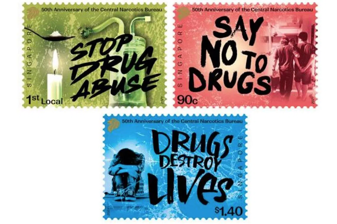 Set setem peringatan itu - CNB50: Continuing the Fight for a Drug-Free Singapore (CNB50: Meneruskan Perjuangan bagi sebuah Singapura Bebas Dadah - mengandungi tiga setem dan dihasilkan dengan kerjasama Singapore Post.