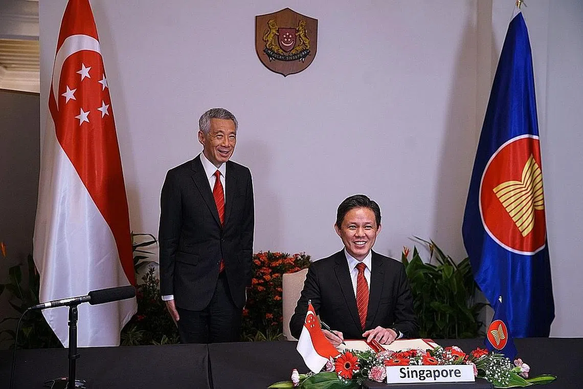 DEMI KEMAJUAN EKONOMI: Menteri Perdagangan dan Perusahaan Chan Chun Sing (duduk) menandatangani perjanjian Kerjasama Ekonomi Menyeluruh Serantau (RCEP) yang melibatkan 15 negara sambil disaksikan Perdana Menteri Lee Hsien Loong (kiri) dan pemimpin negara lain menerusi video semalam. Majlis itu sebahagian Puncak Asean ke-37 dan persidangan berkaitan. - Foto MCI -