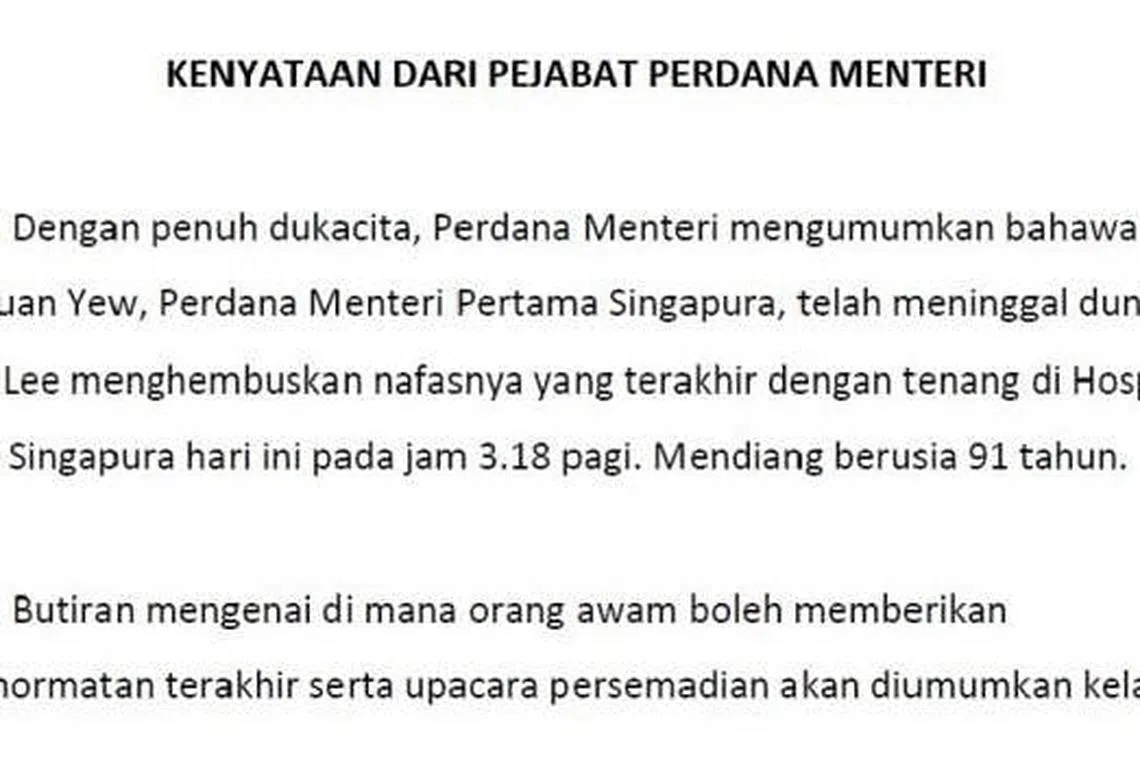 "Dengan penuh dukacita, Perdana Menteri mengumumkan bahawa Encik Lee Kuan Yew, Perdana Menteri Pertama Singapura, telah meninggal dunia.