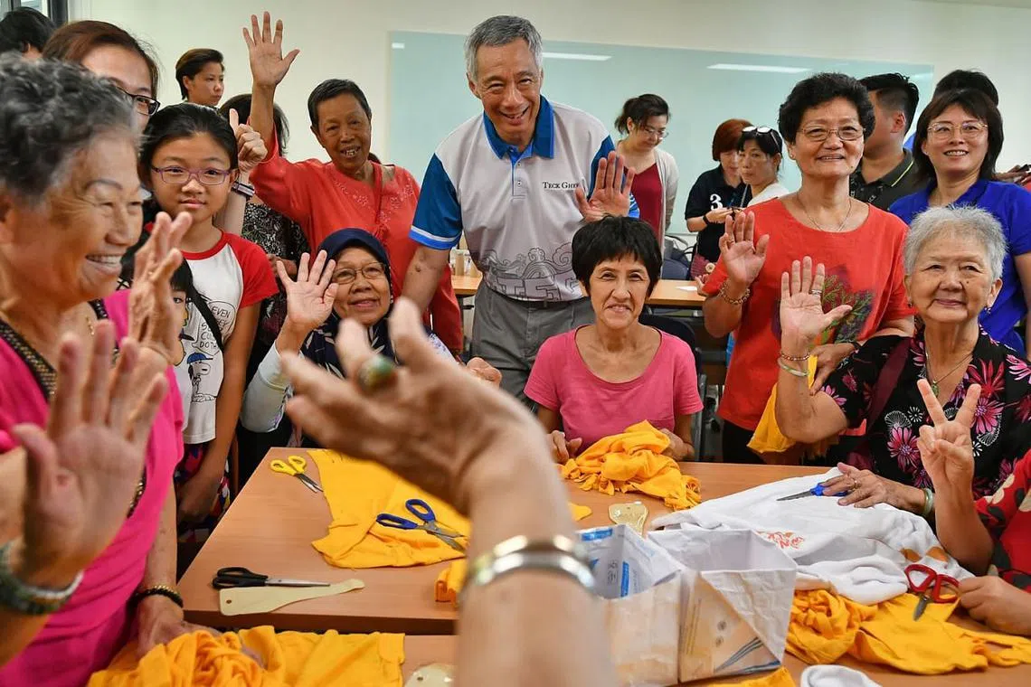 LEBIH BANYAK KEGIATAN: PM Lee menyaksikan penduduk yang sedang membuat kraf tangan menggunakan barangan yang dikitar semula di salah satu bilik kegiatan di Kelab Masyarakat Teck Ghee yang dipertingkat semalam.- Foto BH oleh LIM YAOHUI. -