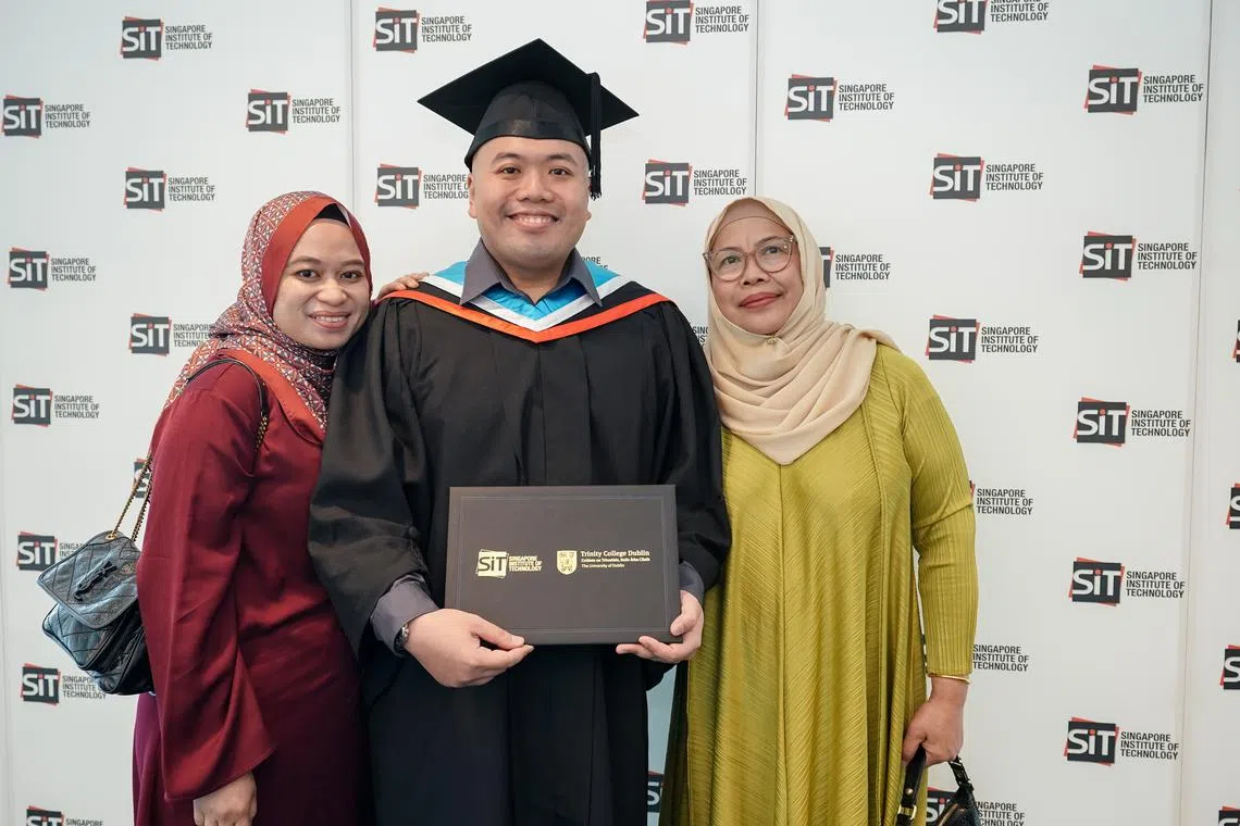 RAIKAN KEJAYAAN: Encik Alfian Redzuan bersama isteri, Cik Filzah Zainal (kiri) dan ibunya, Cik Jamaliah Sutiman (kanan), sewaktu majlis konvokesyen Institut Teknologi Singapura (SIT) baru-baru ini. - Foto SIT