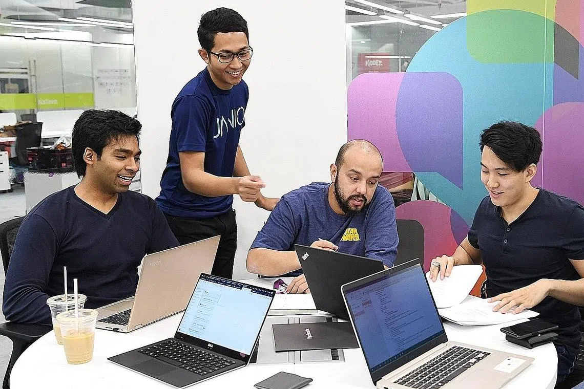 MANFAATKAN TEKNOLOGI: Syarikat Janio, yang diasaskan bersama (dari kiri) Encik Yim, Encik Afiq, Encik Syed Ali dan Encik Ng menggunakan teknologi awan yang membuatkan khidmat penghantaran yang disediakan lancar dan pantas. - Foto BH oleh KHALID BABA -