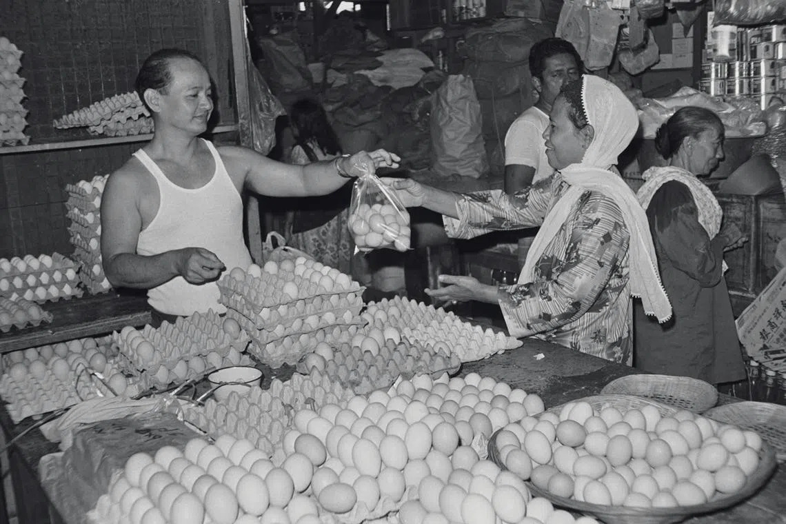 Seorang wanita membeli telur di pasar basah di Singapura, menjelang Hari Raya Aidilfitri dalam gambar yang dipetik pada Ogos 1979 ini.