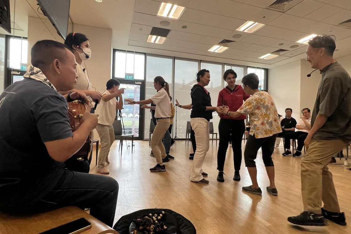 TERAPI TARI: Pesakit demensia seronok menari di bawah bimbingan Encik Osamu Jareo (kanan) dan rentak rebana yang dipalu Encik Yaziz Hassan (kiri). - Foto DEMENTIA SINGAPORE